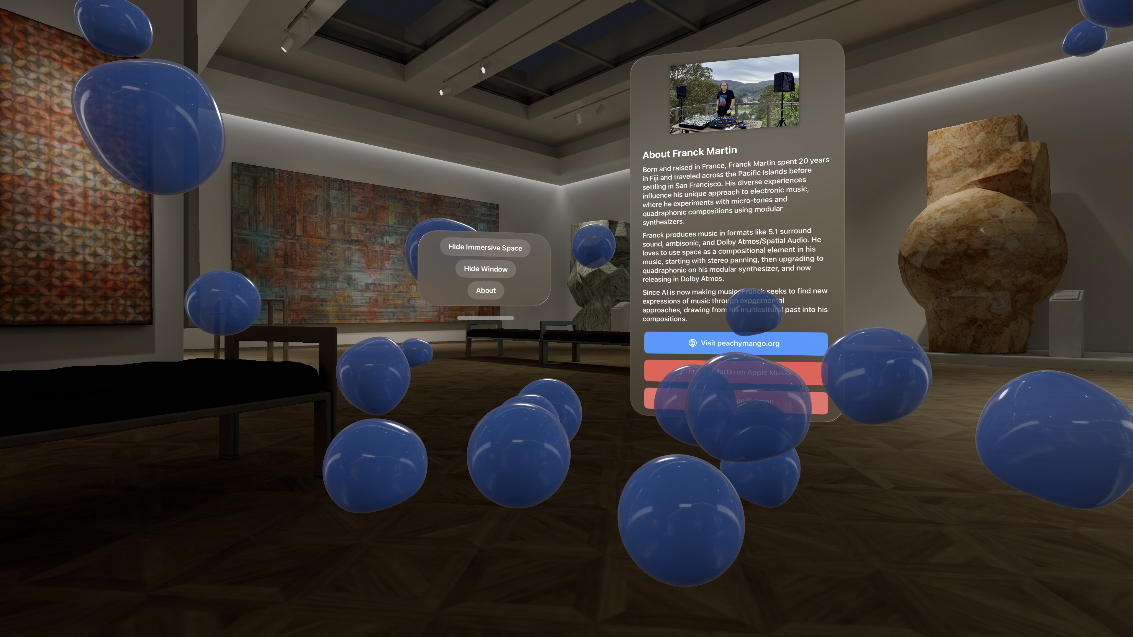 Sonic Zen Spheres is a groundbreaking spatial audio experience for VisionOS. Drift through a tranquil cloud of dynamic, water-droplet-like spheres, each emitting its own musical note. The pitch and volume of the sound shift naturally as you move through the environment, creating a seamless blend of visual artistry and immersive audio.